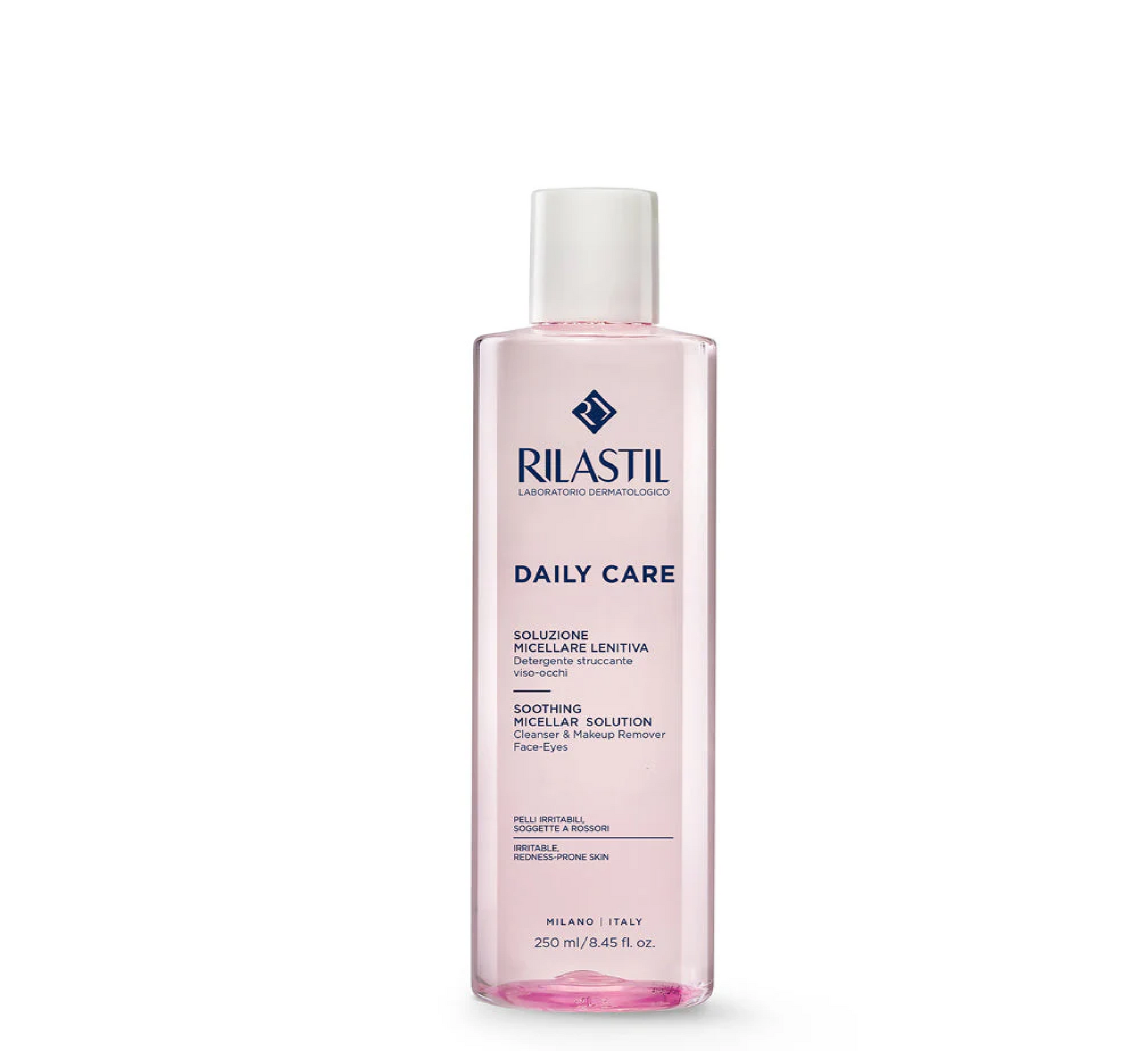 Rilastil Daily Care Soothing Micellar Solution është një pastrues pa shpëlarje dhe heqës grimi për fytyrën dhe sytë. Largon papastërtitë dhe mbetjet e grimit, pa ndryshuar pH natyral të lëkurës, duke e bërë atë ideale për lëkurën e ndjeshme, të irrituar dhe të prirur ndaj skuqjes.